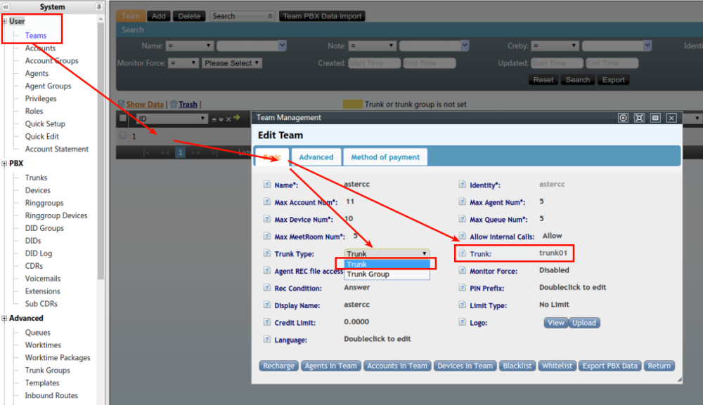 Set the trunks in team
