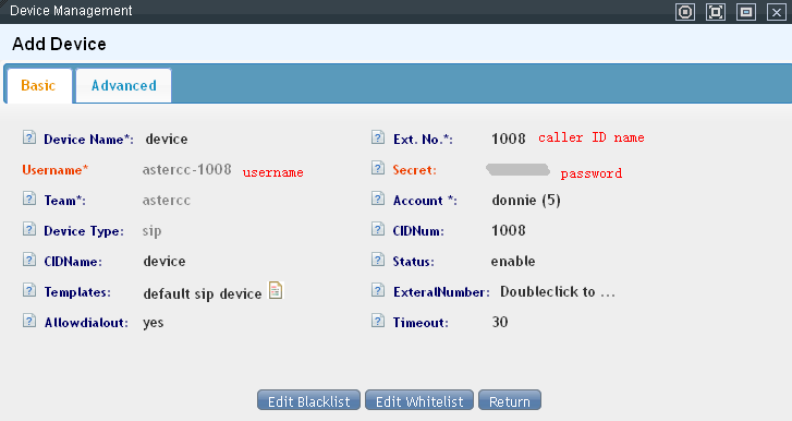 SIP account that corresponds to the system to add a type of SIP extension device, open the Device Manager page, double-click a device record to open the following interface: