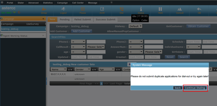 The system will stop the manually dialing if there are erroneous dialing. Add a Continue Dialing button when submit duplicate applications for dial-out.It could remove the data has been dialed before,and insert a new dialing request.