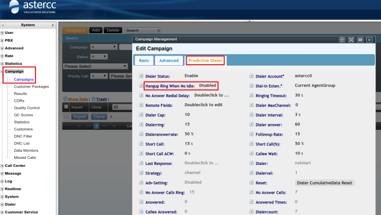 Add function which hugup the ringing agents when there's no idle agent in queue.There is the function switch under [Campaign]→[Campaign Management]→[Predictive Dialer]→[Hangup Ring When No Idle].