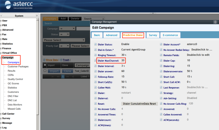 Besides setting in System and Teams,we also set the “Max Dialer Channel” in campaigns. Click [Campaign]→[Campaigns],under “Predictive Dialer” label,there is a field named “Dialer MaxChannel”,it will worked as “Max Calls” on “Advanced” page of Dialer,0 means “No Limitation”,as follows: