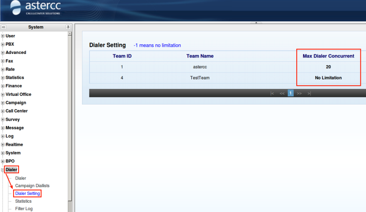 Open the management list on the left,click [Dialer]→[Dialer Setting],you can see the “Max Dialer Concurrent” of all teams,“-1” means “No Limitation”,as follows: