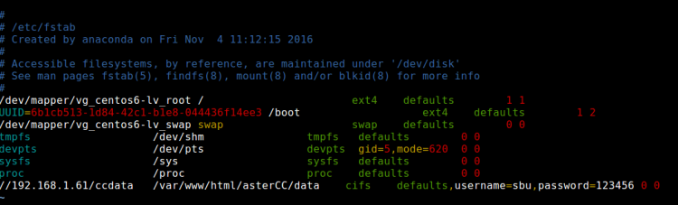 At the end of the document, add the following: //192.168.1.61/ccdata /var/www/html/asterCC/data cifs defaults,username=sbu,password=123456 0 0