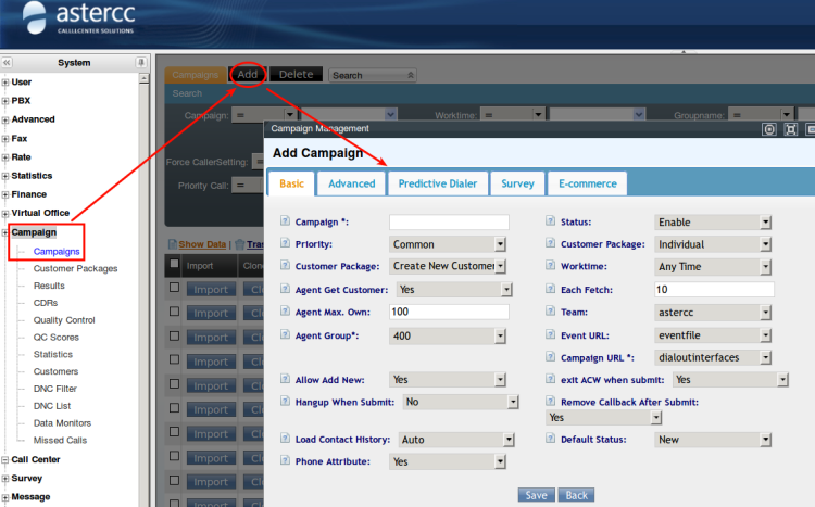 Go to [ Campaign ] → [ Campaigns ],you can go to adding interface via click “Add” on the top of page,as the figure shown below: