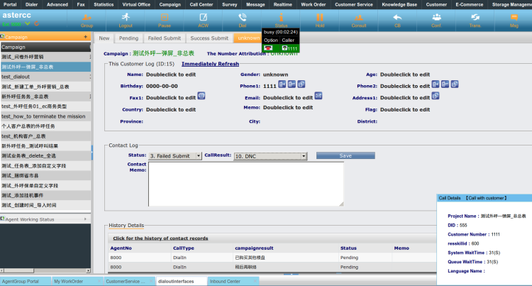 The details of customer will popup under the campaign dialout interface,although the customer dialed in.You can modify and save the details after double-click.And the History details is following,include AgentNo,CallType,CampaignResult and so on.