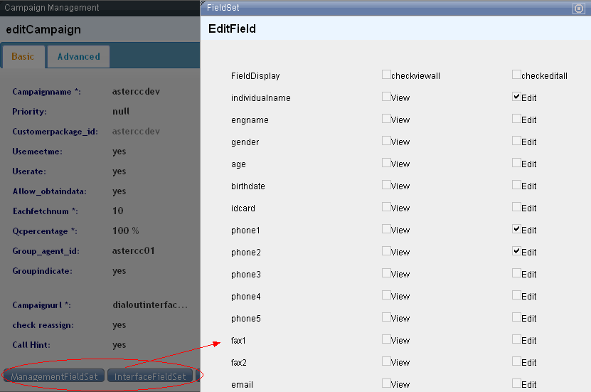 At the bottom of the interface we can see two buttoms of fieldset, in which we can set whether a specific piece of customer information can be viewed or edited. Interface field set is for agents. All the fields are not displayed in the agent interface by default. Here in [Interfacefieldset] you can set for agants, while [Managementfieldset] is for administritor's own use.