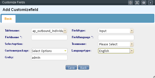 Fieldname: the name of the newly added field, and may contain letters and numbers. The name cannot be started with a number. Fieldlanguage: enter the fieldname to be displayed. If the default language is Chinese, you should enter a Chinese name, and the same applies to English.