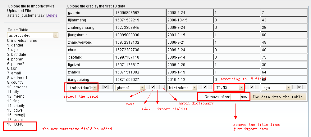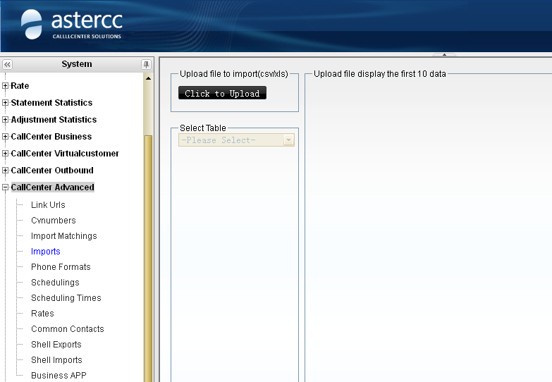 Then we are going to import the customer information which involves these fields. Under the system management, opne Callcenter advanced→ Imports.