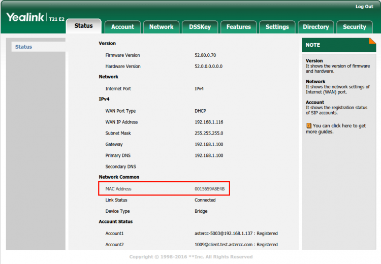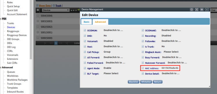 • System's WEB【PBX】–>【Devices】–>Edit a specific device–>【Advanced】–>“MAC Address”, Fill in the MAC address of the yealink phone
