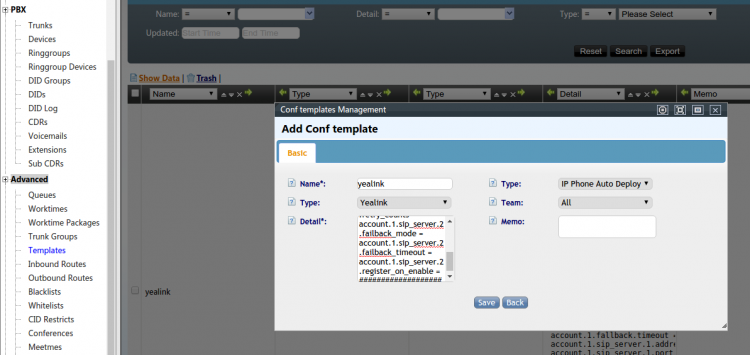 • After successfully saving the PBX template, the following is provisioned.