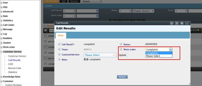select the call result, it will display the link to create the work order