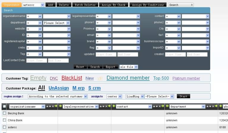 此页面用于操作机构客户总表数据。系统中每建立一个团队,都会为该团队创建机构客户总表和个人客户总表。表内数据可用于呼入客服和外呼营销模块。