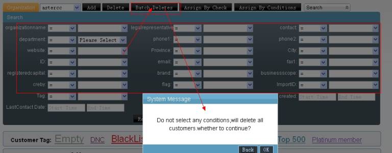 根据当前搜索区域内的搜索条件,查找相关客户并删除。如果你未设置任何搜索条件将删除表内所有客户信息。