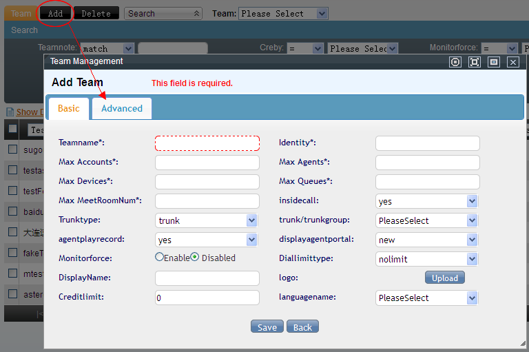 Trunk/Trunk Group: only the Trunk/Trunk group in the system will be listed when adding a team, which means the Trunk/Trunk group haven't been appointed to any team. Choose it only when you have one.