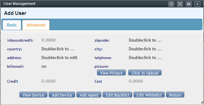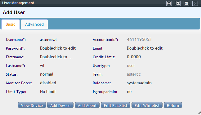 Add device: the same as in PBX Management → Device Management page, click the Add button and add an device in this account.