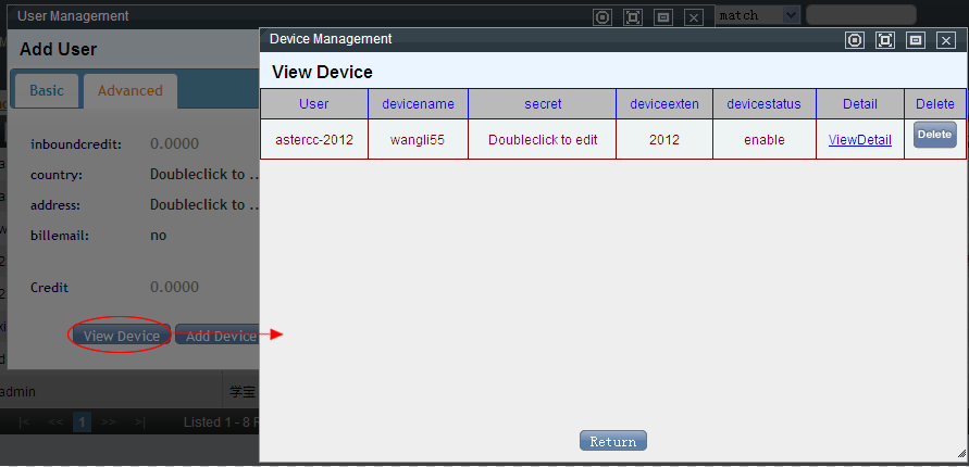 This interface lists all the devices' brief information under this account. Click ViewDetail to get in the PBX management →device management page, and in the meantime open the edit page of the information, equals to editing a device on the device management page.