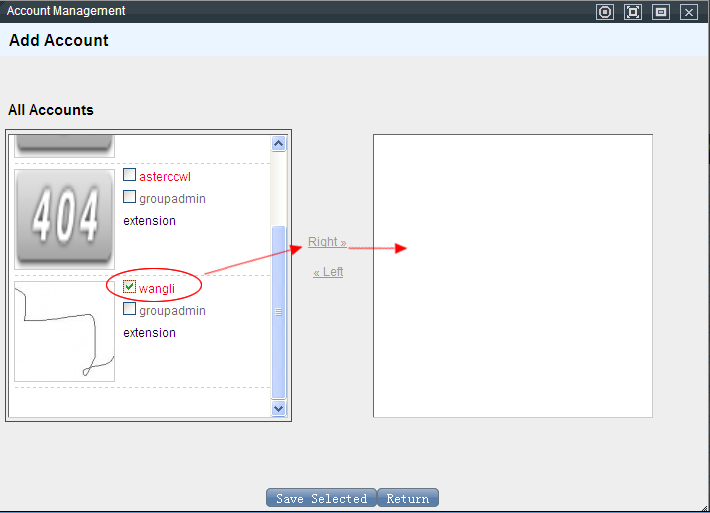 The accounts which can be chosen into the group are listed on the left, click the “Right” button to add them into the group. The accounts in the list on the right are those already in the account group, you can click “Left” button to remove them.