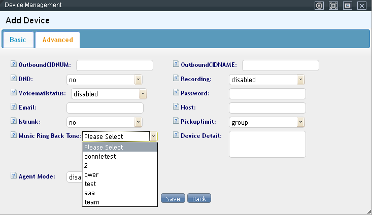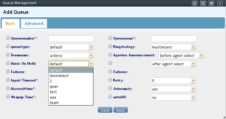 In the Music on Hold's dropdown menu, you can see all the music files of the team. These can also be applied to the music ring back tone.