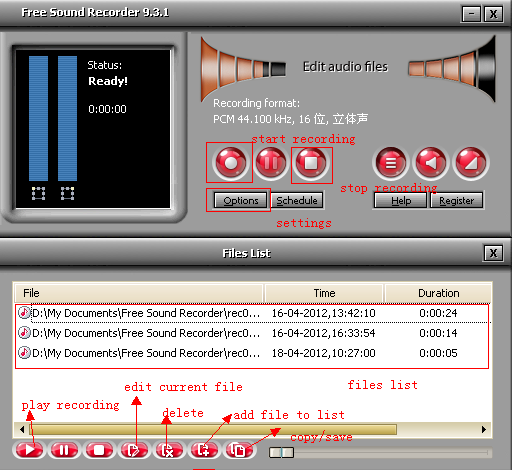 Record with the Free Sound Recorder and upload to the system, which supports one formats: wav(8000KHz,16bit)