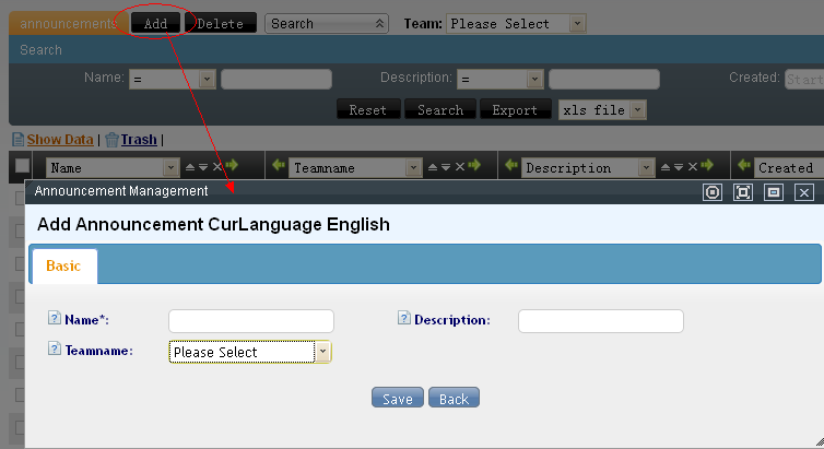 Enter a name for the announcement. Choose a team for its application scope, and do not choose if you want to apply this announcement for all teams. Then click “save”.