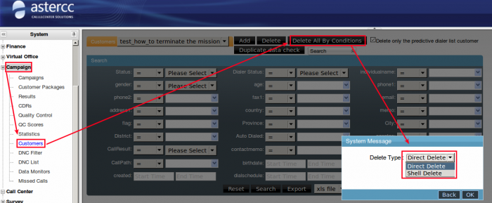 Deleting customer data:On [Campaign]→[Customers]. First we should choose “Customer”, and then click the button named [Delete All By Conditions],it will throw a tips “Delete Type”,including:Direct Delete and Shell Delete. As the name suggests, “Direct Delete” means delete directly on this page right now, while “Shell Delete” represents delete the customer data when the system scanning the “shell delete jobs” per minute.