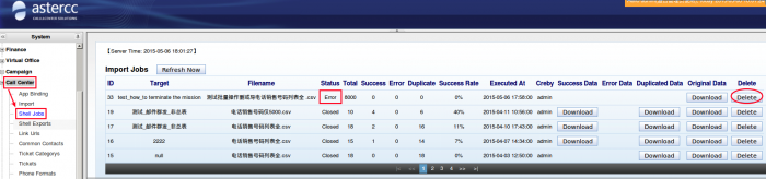 How to stop the “Import” operating ? We just click the [Delete] in [Call Center]→[Shell Jobs]→[Import Jobs].