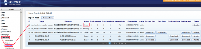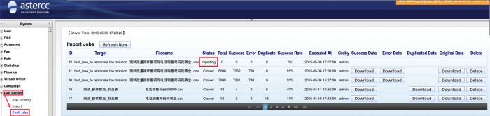 When the import job was be finished,we can find the status of task in [Call Center]→[Shell Jobs] is “Import”,as following: