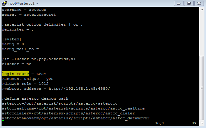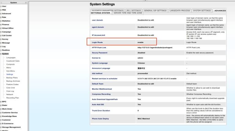 First, enable this function. Edit the /etc/astercc.conf file on the server, find login_route = team and delete the 注释标志, and enable it.