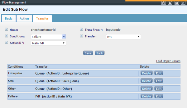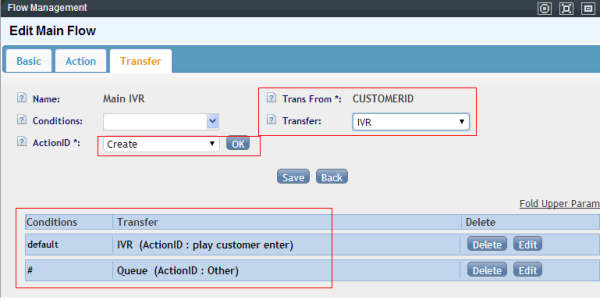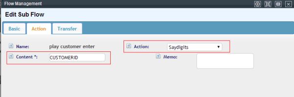 set the transfer condition, if caller have no customerid , the annoucement tell him enter the '#', else enter his customer id, so if ivr reiceived '#', we transfer the call to the queue named “Other”, if reiceived the 'customer id', then transfer a sub flow that let customer confirm them entered customer id.