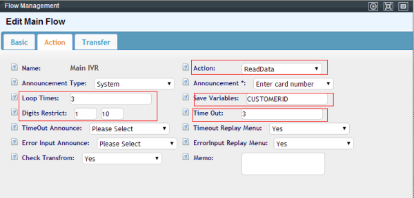 second, add a readdata action(play a announcment and receive customer enter)