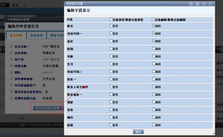点击 前台字段显示设置 按钮,为计划指定客户资料的哪些字段是坐席可以看到的,哪些是可以修改的