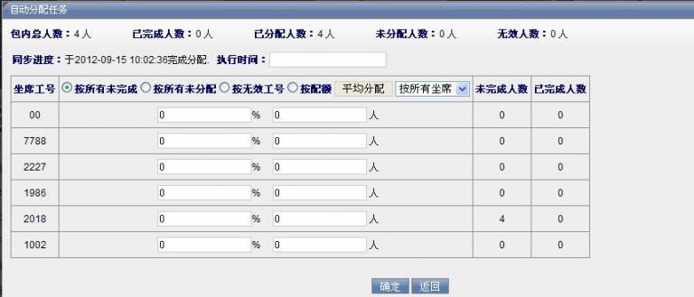 自动分配计划有按所有未完成和按所有未分配两种分配方式。在坐席工号后面对应的文本框里输入总人数百分比,系统就可以自动为该坐席分配客户。点击 确定 按钮,就可以保存自动分配计划。