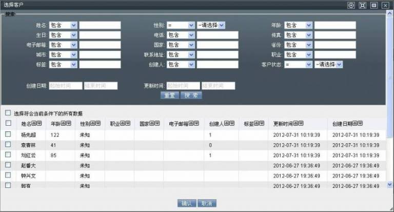 点击【选择客户】按钮时,可以从总表选择数据复制到客户包内。(如果勾选“选择客户”按钮旁的选框,会将所有总表内客户复制到包内。)