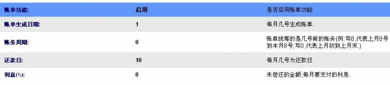账单周期:账单统筹的是几号前的账务(例:写8,代表上月8号到本月8号;写0,代表上月初到上月末.)