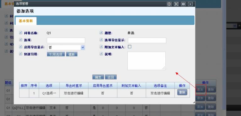在问题编辑页面,每个问题(单选题,多选题,组合题)后边都有一个选项【添加】按钮。点击此按钮,打开选项添加界面。