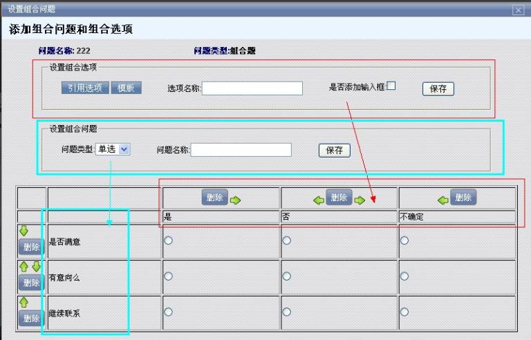 题 型:单选(多个选项,只能选一个),多选(多个选项,可以选多个。系统可以设置最少,最多选几项),组合(一个大问题下由多个小问题和选项组合而成),文本(一个文本输入框,用于填写大量文字内容)。