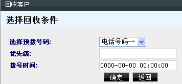 回收时,需要填写以下参数 预拨号码:指定拨号器要拨打客户哪个号码字段。 优先级:数字越大,越优先拨号。 拨号时间:可以指定什么时间才拨号。0000为任何时间。