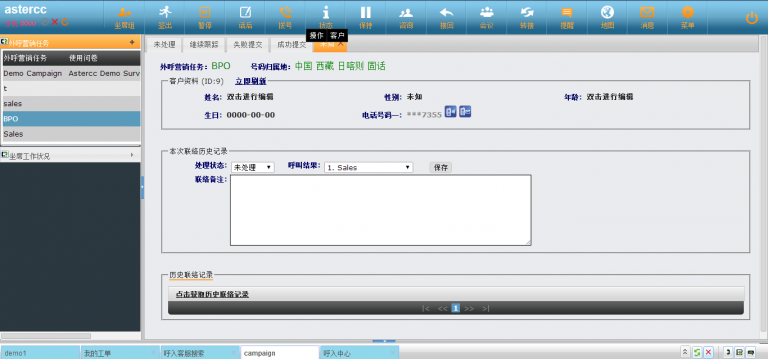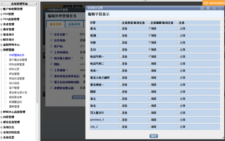 • asterCC的外呼营销模块中,用户可以通过“后台字段显示设置”和“前台字段显示设置” 来控制不同地方显示的客户信息以及权限