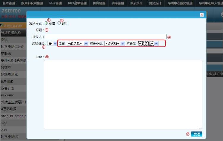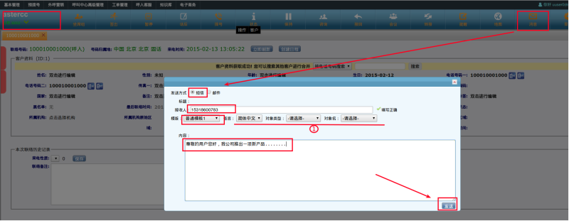其次,登录坐席,点击[消息],选择[短信],还有标题、接收人、模板、语言、对象类型、对象名。我们要使用刚才新添加的模板,只需点击[模板]后面的下拉框,即可找到并选择。需要注意的是,接收人只能填写手机/电话的号码。内容处填写需要发送短信的内容,填写完毕后,点击[发送]
