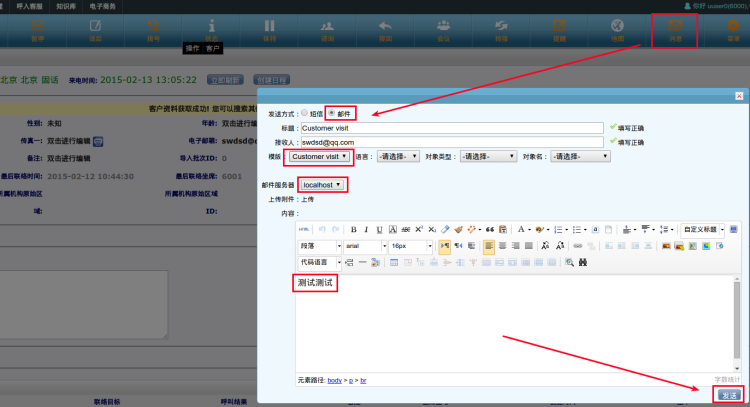 坐席登录界面后,可以直接点击[客户资料] 电子邮箱右面的信封图标,来编辑和发送电子邮件。