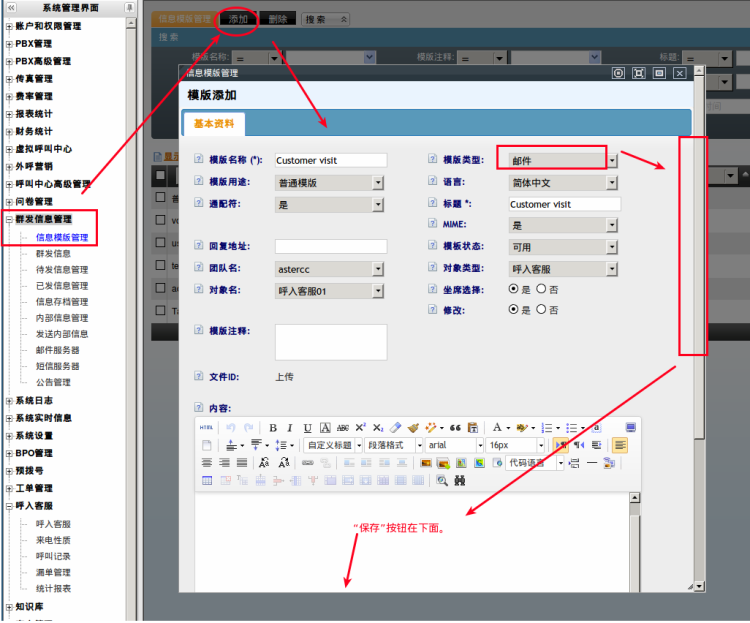 模板类型:用来设置添加的模板是用来发短信,邮件还是传真,如选择短信,则不需要添加标题。发短信时,只能选择短信类的模板;同样,发送邮件或传真时,也只能选择同类的模板 单击