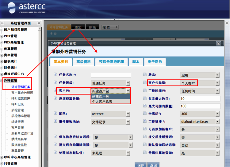 左侧管理列表,点击【外呼营销】–>【外呼营销任务】–> “添加”,打开任务添加页面,如下图: