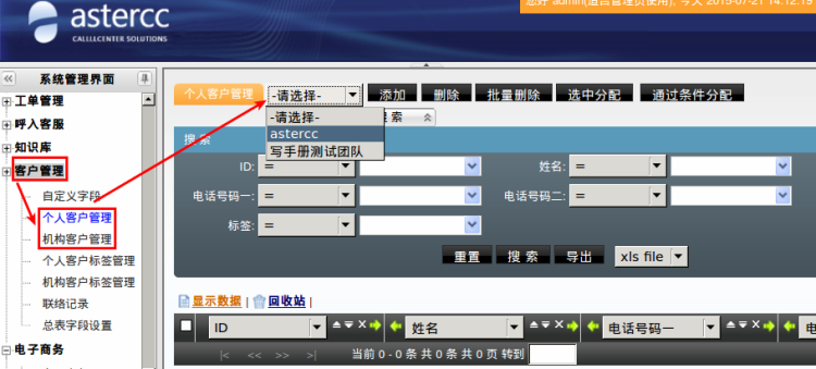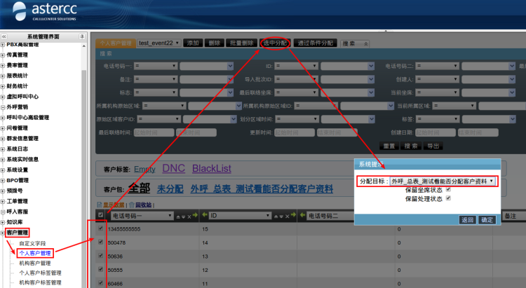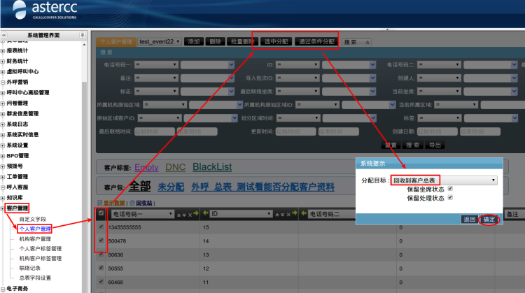 左侧管理列表,点击[客户管理]→[个人客户管理],按条件筛选出将要回收的数据,选中后,点击[选中分配]按钮,将分配目标选择为:回收到客户总表,点击[确定]按钮,如下图: