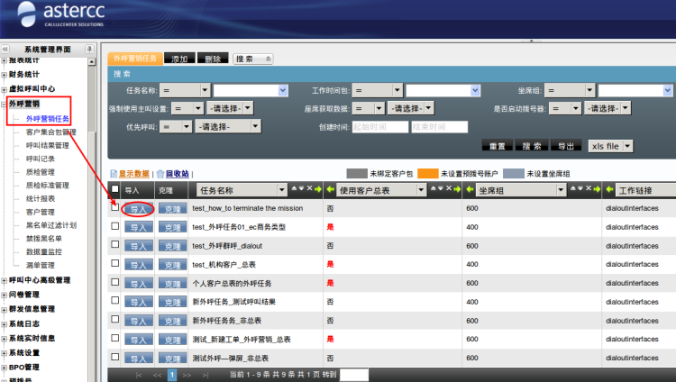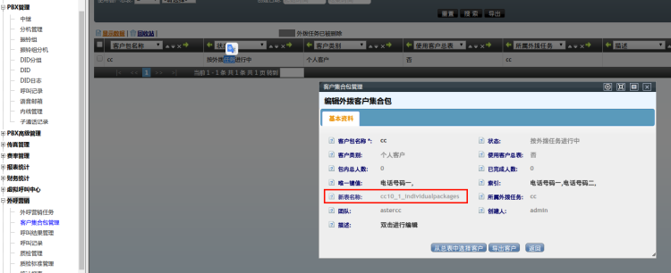 新建客户包:创建该任务时,系统会自动创建一个同名的客户包,这个客户包的表是所属这个任务下的私有表,而不是团队客户总表,此表在【外呼营销】–>【客户集合包管理】中可看到。假如往该任务中导入数据,则导入数据不会导入到总表中。查看客户数据,需要先选择外呼任务,如下图: 【外呼营销任务】–>【客户集合包管理】–>打开具体的包名称,“新表名称”即为mysql内创建的任务表。
