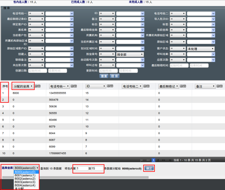 点击按钮后,进入分配页面,选择要分配给哪个座席,是将数据包内第几条到第几条分配给所选坐席,选择好后点击[确定]按钮,如下图:
