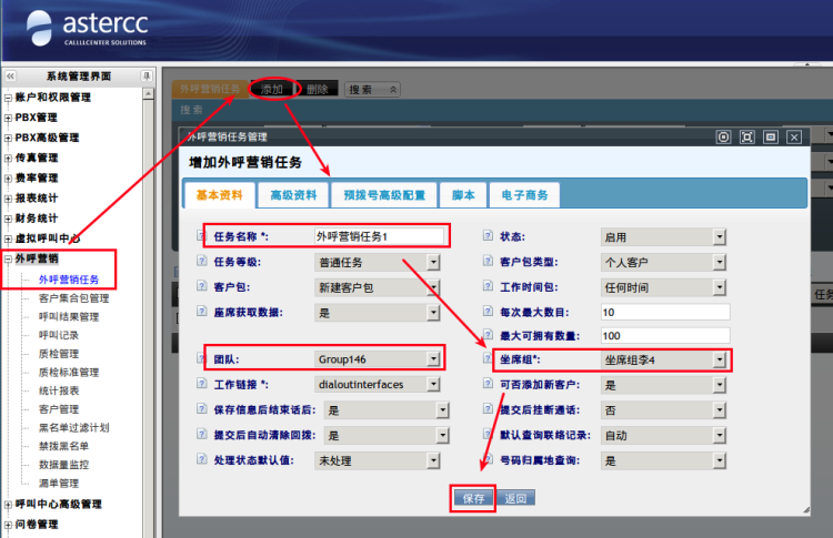 其次,创建所需要的功能模块,如:呼入客服、外呼营销、虚拟呼叫中心。此处以“外呼营销”为例,点击[外呼营销]→[外呼营销任务]→[添加],填写完内容后点击[保存]
