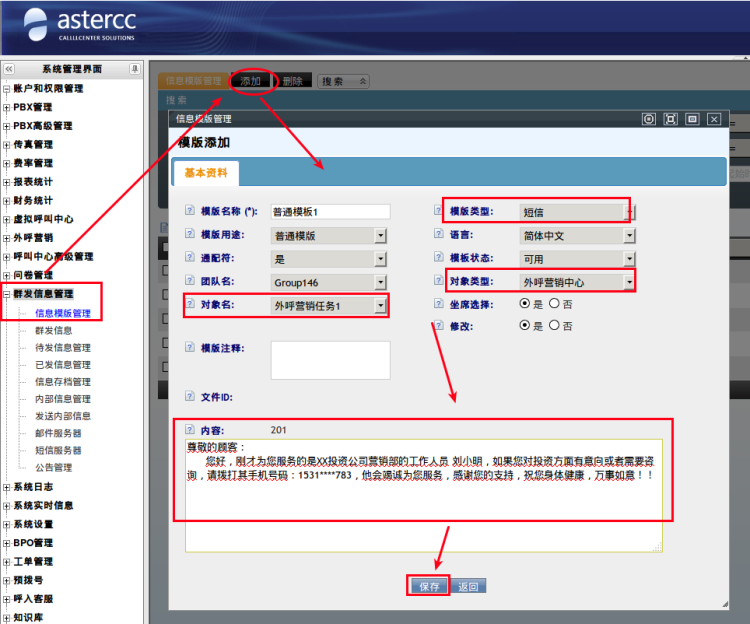 首先,创建模板,此处以“短信模板”为例进行介绍。点击[群发信息管理]→[信息模板管理]→[添加],编辑完所需内容后,点击保存。