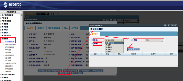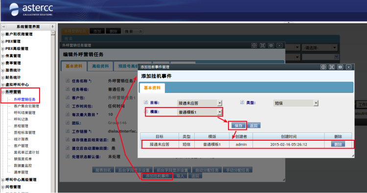 保存完成后,会出现刚才新建的“外呼营销任务”的记录,双击它进行编辑。点击[添加挂机事件],会弹出添加挂机事件面板,选择事件目标(例:接通未应答),点击模板后选择需要添加(刚新建的)的模板,点击[保存],在下面会出现一条记录。