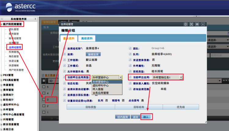 点击[账户和权限管理]→[坐席组管理],双击要添加动作的那个坐席组,基本资料中的[当前呼出应用类型]选择“外呼营销中心”,点击[确定]按钮后,相应的[当前呼出应用]会出现刚才建立的带有模板动作的 “功能模块”,点[返回],这样 短信模板就添加完成了。