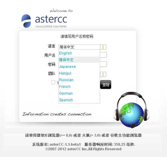 语言名称及该语言其他信息填好之后,点击保存按钮。如果您启用了登陆语言,那么在登陆界面处的语言下拉列表中会全部显示